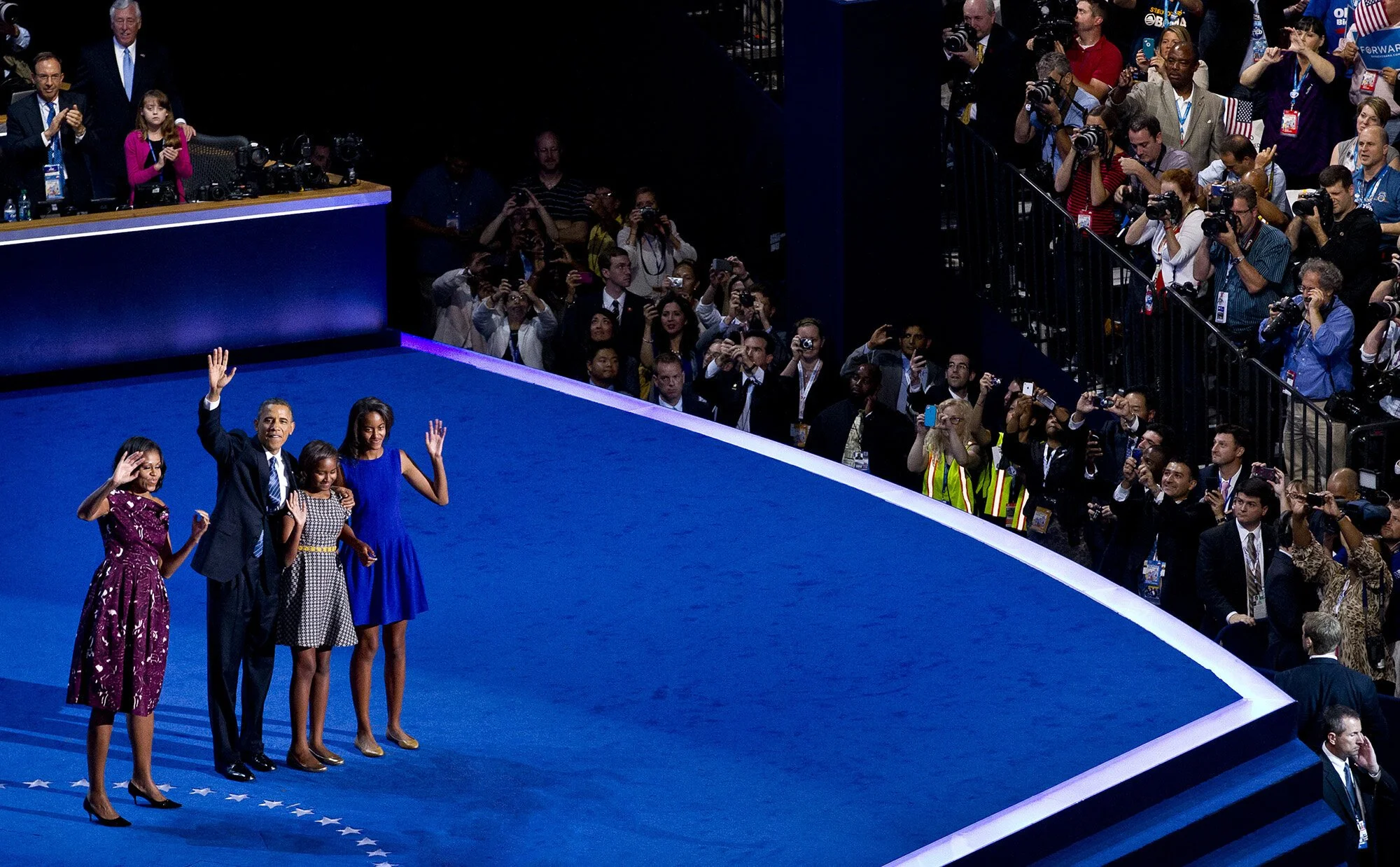 The Obama family take the stage after President Barack Obama's speech in the Time Warner Cable Arena during the 2012 Democratic National Convention in Charlotte, North Carolina. / photo by David Scott Holloway / ©2012 All Rights Reserved